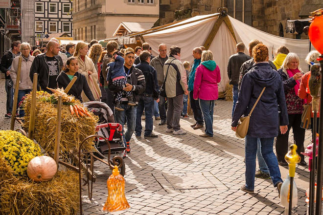 Jedes Jahr Anfang Oktober findet der Herbstmarkt in Hameln statt. Das Areal rund um Marktkirche und Hochzeitshaus verwandelt sich in einen bunten Markt. Kunsthandwerkern kann man bei ihrer Arbeit ebenso über die Schulter schauen wie Floristen beim Zusammenstellen von Blumengestecken. Auch kulinarische Spezialitäten von Erzeugern aus der Region sind auf dem Hamelner Herbstmarkt vertreten. Am Sonntag beteiligen sich die örtlichen Einzelhändler mit einem verkaufsoffenen Sonntag. (© FuM)
