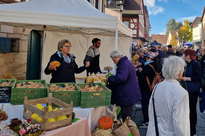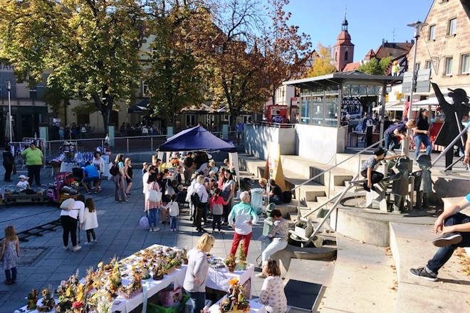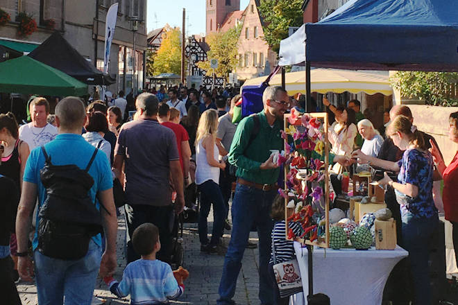 Zum Herbstmarkt in Zirndorf bauen zahlreiche Händler ihre Marktstände in der Innenstadt auf. Das Angebot reicht von Kunsthandwerk und Geschenkartikeln über Mode und Schmuck bis hin zu nützlichen Dingen für Haus und Garten. Die Zirndorfer Einzelhändler beteiligen sich mit einem verkaufsoffenen Sonntag am Herbstmarkt. Für das kulinarische Wohl der Marktbesucher sorgen neben Gastronomieständen die Gaststätten und Cafés in der Innenstadt. Die Kinder dürfen sich auf Mitmachaktionen, eine Eisenbahn sowie eine Detektiv-Rallye freuen. Eine Stadtführung sowie ein Besuch der Ausstellungen des Städtischen Museums runden den Herbstmarkt in Zirndorf ab. (© FuM)
