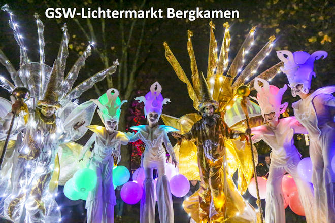 Zum Lichtermarkt in Bergkamen präsentieren etwa 80 Verkaufsstände regionale Produkte und westfälisches Kunsthandwerk auf dem Stadtmarkt. Straßenkünstler aus aller Welt machen diesen Abendmarkt zu einem besonderen Erlebnis. Lichterzauber und zahlreiche Showacts sorgen für Unterhaltung und Begeisterung bei den Besuchern. Der Lichtermarkt in Bergkamen findet jedes Jahr am letzten Freitag im Oktober statt. (© FuM)