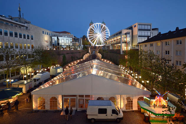 Der Pirmasenser Novembermarkt findet in diesem Jahr wieder auf dem unteren Schlossplatz statt. Am Freitag wird der Markt durch den Oberbürgermeister gegen 18 Uhr offiziell eröffnet. In einem großen beheizten Weinzelt bieten Pfälzer Winzer ihre Weine an. Der Küchenmeister Eric Kunz vom gleichnamigen Hotel-Restaurant serviert zu den edlen Tropfen die passenden Speisen. Natürlich gibt es auch die klassischen Grillspezialitäten, Flammkuchen oder Crepes rund ums Zelt. Live-Musik rundet an allen Tagen den Novembermarkt in Pirmasens ab. Ein besonderer Anziehungspunkt ist das 40 Meter hohe Riesenrad vor der Pirminiuskirche. Zusätzlich wartet auf die kleinen Besucher ein Kinderkarussell, ein Trampolin, sowie ein Süßwarenstand. Der verkaufsoffene Sonntag von 13 bis 18 Uhr lädt zum Shoppen und Verweilen ein. (© FuM)