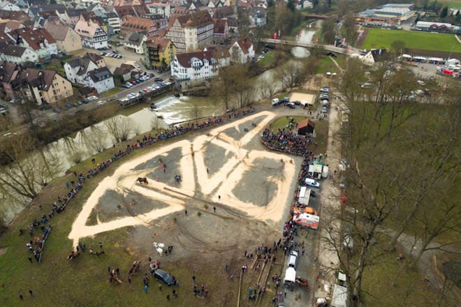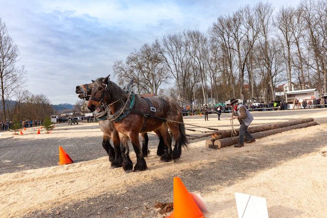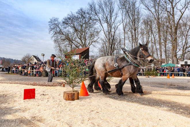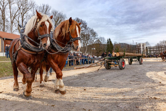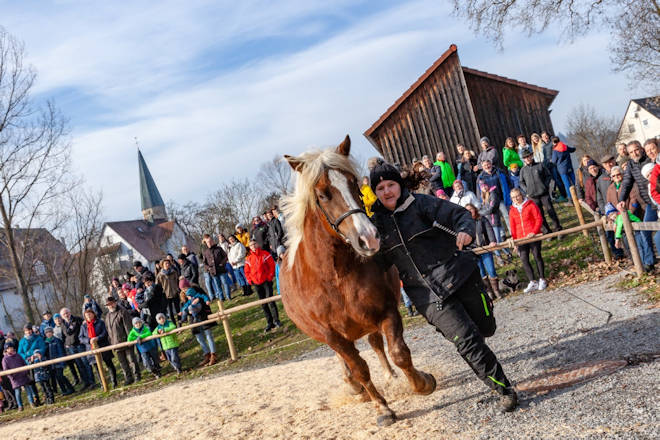 Der Pferdemarkt in Gaildorf findet 2025 bereits zum 87. Mal statt. Dabei hat der Gaildorfer Pferdemarkt im Laufe seiner fast 100-jährigen Geschichte eine Wandlung vom reinen Viehmarkt zu einem der größten Volksfeste im Limpurger Land vollzogen. Beim allerersten Pferdemarkt im Februar 1928 stand noch der Viehhandel im Mittelpunkt. Der Zeitpunkt im Winter wurde gewählt, weil die Landwirte zu diesem Zeitpunkt gut einschätzen konnten, wie lange die Futtervorräte noch reichen. Durch den Verkauf von Vieh konnte man so die Vorräte etwas strecken. Als in den 50er und 60er Jahren des letzten Jahrhunderts Zugpferde immer mehr aus dem Alltag verschwanden, eroberten Reit- und Sportpferde den Pferdemarkt in Gaildorf. Heute ist der Gaildorfer Pferdemarkt ein weit über die Grenzen der Region bekanntes Traditionsfest. Eröffnet wird der Pferdemarkt am Freitagabend mit einem Fachvortrag. Zum festen Programm gehören am gesamten Wochenende die Landmaschinenausstellung und der Festzeltbetrieb in der Körhalle. Am Samstag steht die Präsentation "Ross und Forst" auf der Kocherwiese, zu dem auch der Fuhrmannstag mit Holzrückewettbewerb gehört, auf dem Programm. Die Pferdeprämierung am Sonntag und die Kutschenprämierung am Montag ziehen ebenfalls viele Besucher an. Höhepunkt des Gaildorfer Pferdemarktes ist der Festumzug am Montag um 14 Uhr, welcher auf von Guggenmusikern begleitet wird. In der Regel bereichern ein verkaufsoffener Sonntag der örtlichen Einzelhändler und am Montag ein Krämermarkt den Pferdemarkt. Der Termin für den Gaildorfer Pferdemarkt wird so gewählt, dass der Pferdemarktmontag auf den zweiten Montag im Februar fällt. (© FuM)
