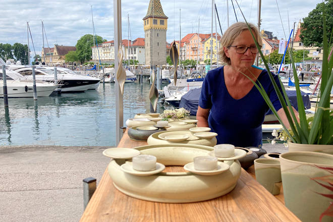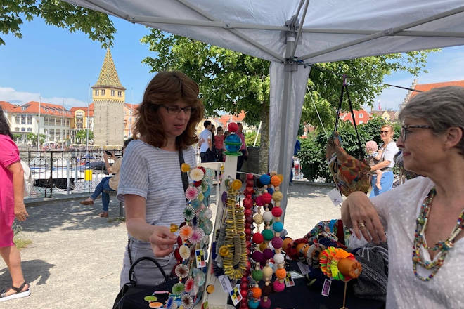 Am letzten Ferienwochenende findet der Kunsthandwerkermarkt "Kunsthandwerk und Genuss" in Lindau (Bodensee) statt. An ca. 40 bis 50 Ständen werden hochwertiges Kunsthandwerk sowie Töpferwaren angeboten. Neben Deko für Haus und Garten sowie Keramik für Tisch und Balkon reicht die Palette von Schmuck über Kleidung bis zu Spielzeug. Besondere Genussmittel, gerne bio und viele auch regional, runden seit 2016 das Angebot dieses Marktes ab. (© FuM)