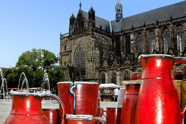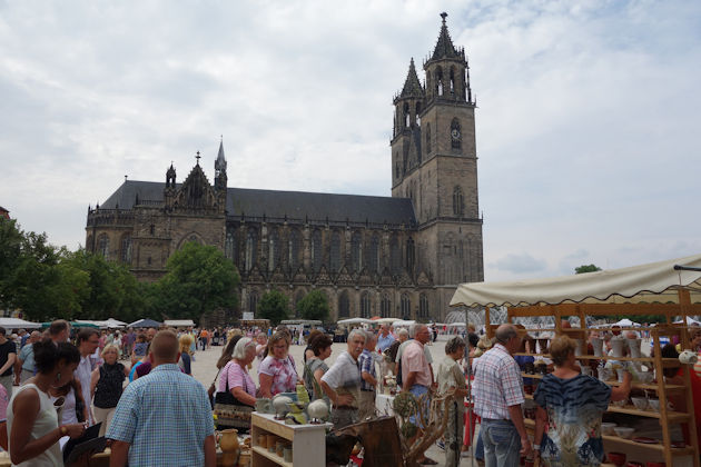 Der traditionelle Töpfermarkt in Magdeburg am ersten Augustwochenende findet in diesem Jahr erneut auf dem Domplatz statt. Diesmal sind rund 70 Kunstkeramiker und Töpfermeister aus Deutschland, Polen, Litauen, Ungarn und Belarus vertreten. Neben Gebrauchskeramik wird auch moderne Töpferei mit Skulpturen, Reliefs oder Schmuck gezeigt. Diese Exponate überzeugen nicht nur durch Form und Farbe, sondern auch wegen der künstlerischen Ideen und dem handwerklichen Geschick. Wie in den Vorjahren gehören Vorführungen auf der Töpferscheibe zum Magdeburger Töpfermarkt dazu. Textil-Designer, Drechsler und Korbmacher vervollständigen die Palette der anwesenden Handwerker. Organisiert wird der Töpfermarkt durch "HK-Keramikmarkt" mit Unterstützung der Stadt Magdeburg und Magdeburg Marketing Kongress & Tourismus GmbH. (© FuM)